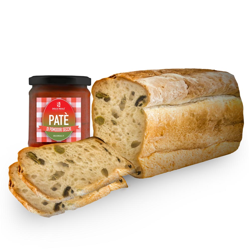Prodotto da forno con pomodori secchi e olive verdi da 200g con vasetto di patè di pomodori secchi e pistacchio da 180g.